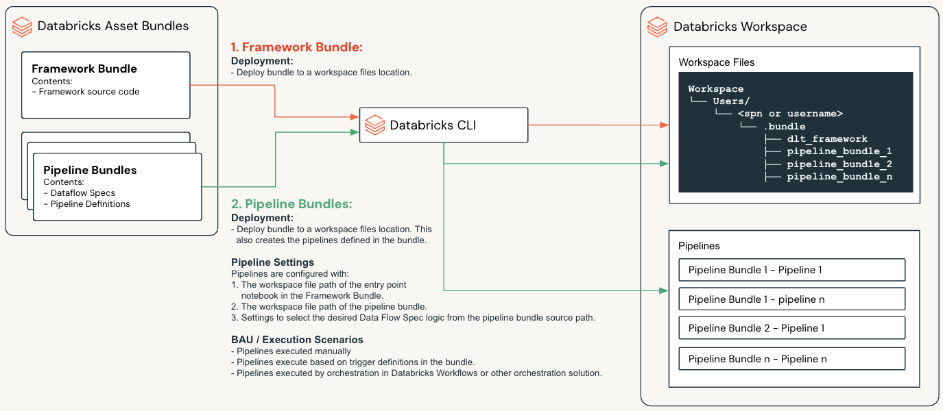 The Framework Bundle is deployed to a given workspace files location from where it’s source code can be referenced by any deployed Pipelines.