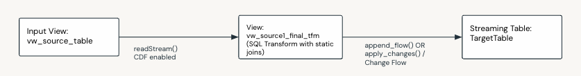 Input view created over the streaming source table that will ultimately static join to one or more additional source tables, in the next view below. This view can optionally read from CDF if the source table is CDF enabled. |