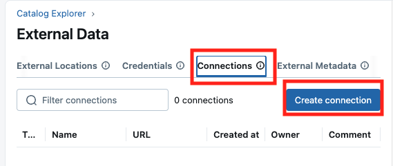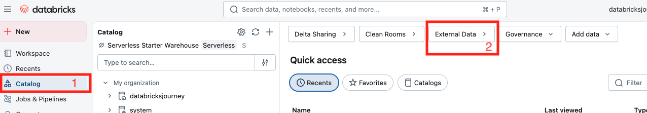 In the left sidebar, click on "Catalog" and then click on "External Data"