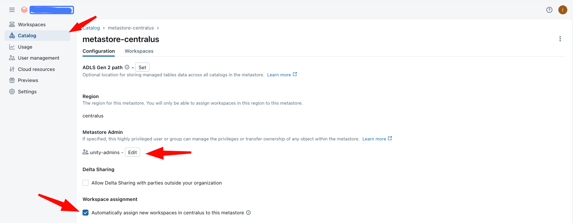 - Select the metastore auto-assignment on new Workspaces.